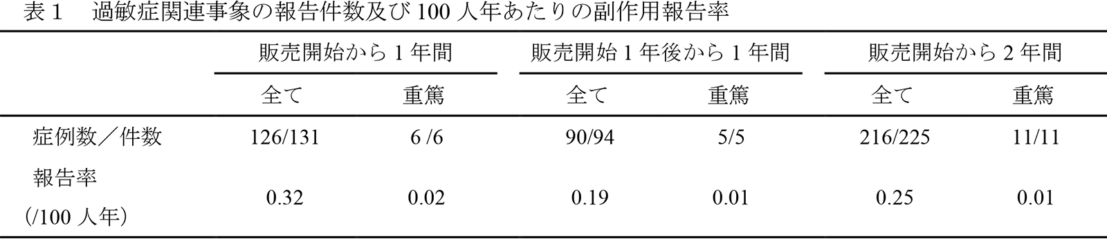 出荷数量から算定した推定累積投与患者数*を用い、販売開始から1年間、販売開始1年後から1年間、及び販売開始から2年間における曝露期間で調整した100人年あたりの過敏症関連副作用の報告率を算出しました(表1)。なお、製造販売後において収集された有害事象情報は自発報告であり、臨床試験からの情報とは異なり本剤を処方されている患者の背景因子が異なること、実際に本剤を投与された累積投与患者数を正確に把握することは困難であるため、本剤の出荷数量から算定した推定投与患者数を使用していることにご留意ください。